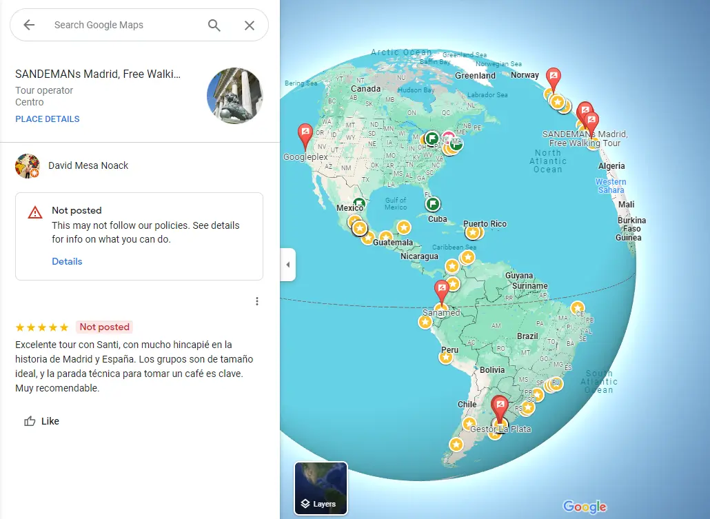 Caso 2: SANDEMANs Madrid, Free Walking Tour Aquí, el usuario elogia un tour gratuito en Madrid, enfatizando la calidad del guía turístico y la organización del tour. Nuevamente, la reseña parece ser útil, informativa y específicamente relevante para los servicios ofrecidos. Sin embargo, fue rechazada, lo que plantea preguntas sobre los criterios de moderación y su aplicación.
