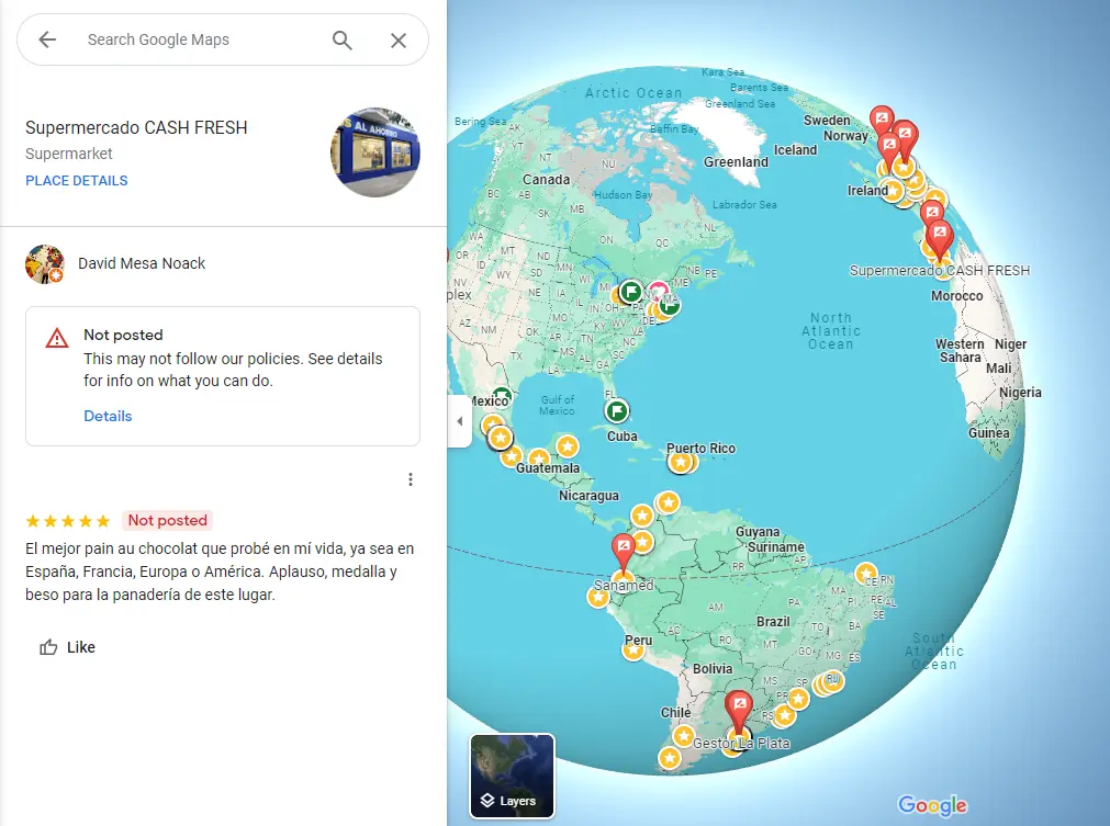 Caso 1: Supermercado CASH FRESH Un usuario compartió su entusiasmo por el «mejor pain au chocolat» que había probado, no solo en España, sino también en Francia, Europa y América. Este comentario parece ser una reseña positiva genuina, destacando un aspecto específico (la panadería) del supermercado. La razón detrás del rechazo de esta reseña no es evidente, ya que aparentemente cumple con las directrices de contenido relevante y específico para el lugar. Lo más grave de esta situación, es que el usuario tiene en su historial de visitas casi todos los países de América, y múltiples ciudades de España y Francia, tal cual se puede ver en la imagen. Por lo tanto, es posible inferir que la reseña era genuina (siempre y cuando no comente lo mismo en todos los lugares que visita) y fue indebidamente rechazada. Ese ‘pain au chocolat’ era, genuinamente, el mejor que este usuario había probado en su vida, en las localidades mencionadas.